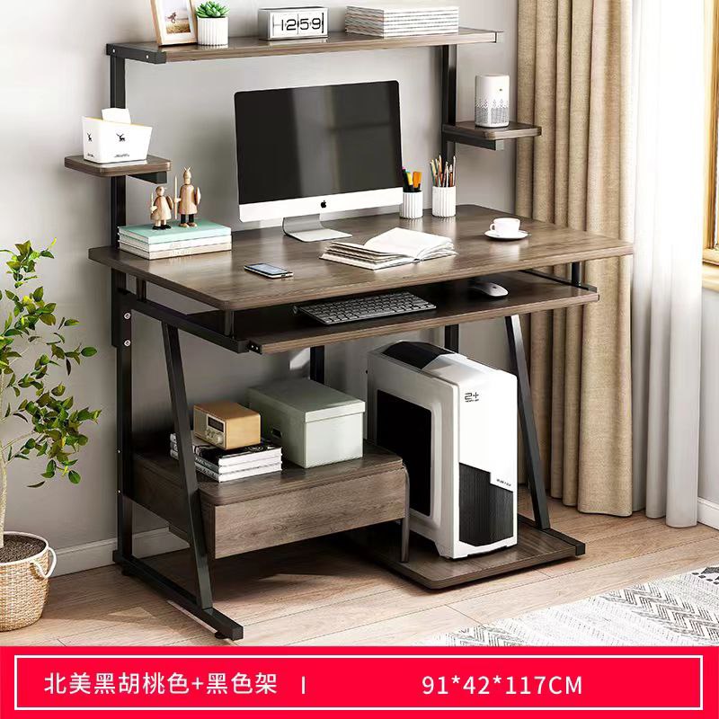 طاولة كمبيوتر بهيكل معدني و رفوف خشبية و جرار سفلي